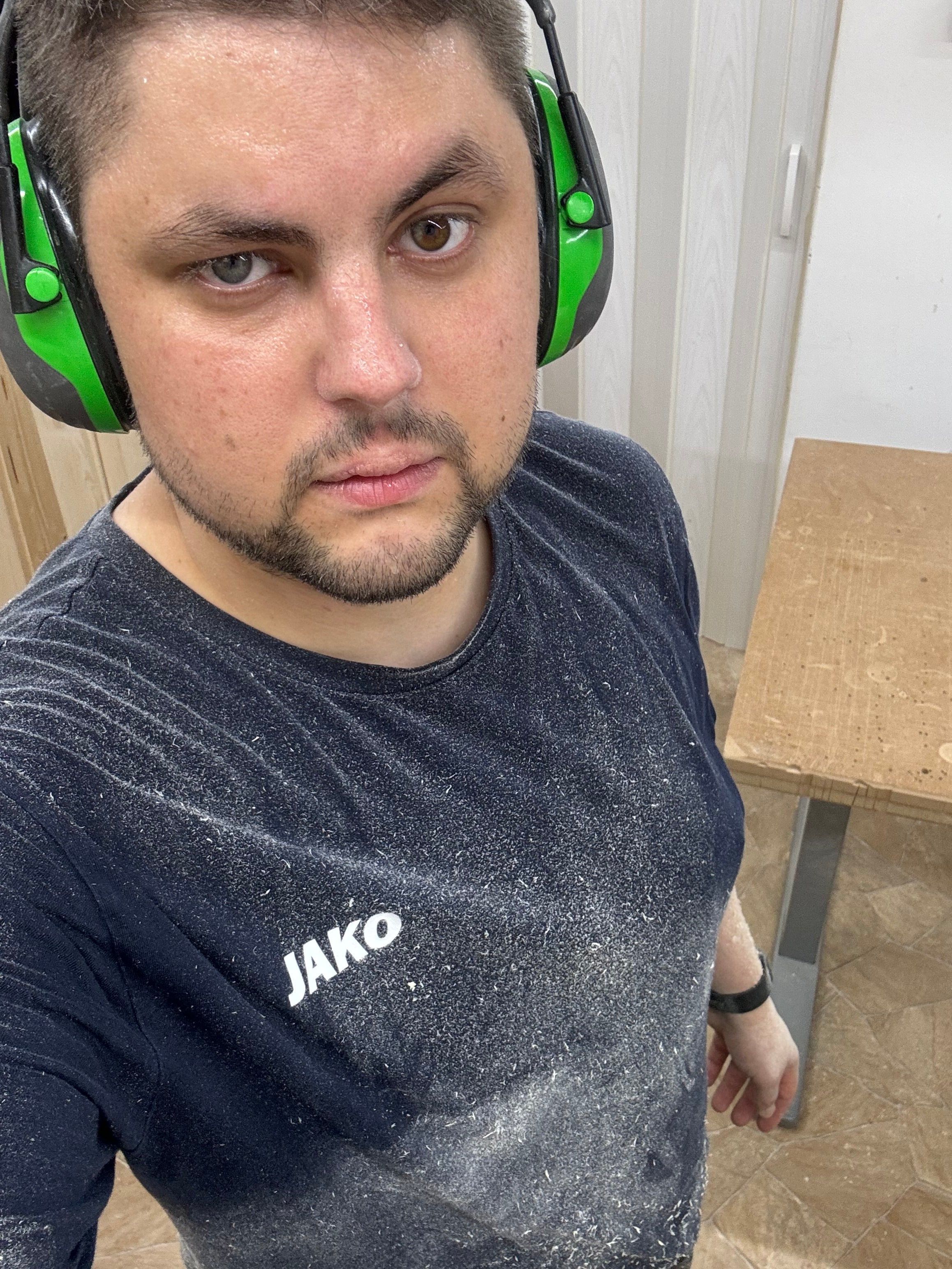 Ich bin Mike, 34 Jahre alt, komme ursprünglich aus Zons bei Dormagen – ein kleines, ruhiges Dorf am Rhein – und bin der Mann für alles, was in der Hoppel-Werkstatt gesägt, geschraubt oder geplant werden muss.
