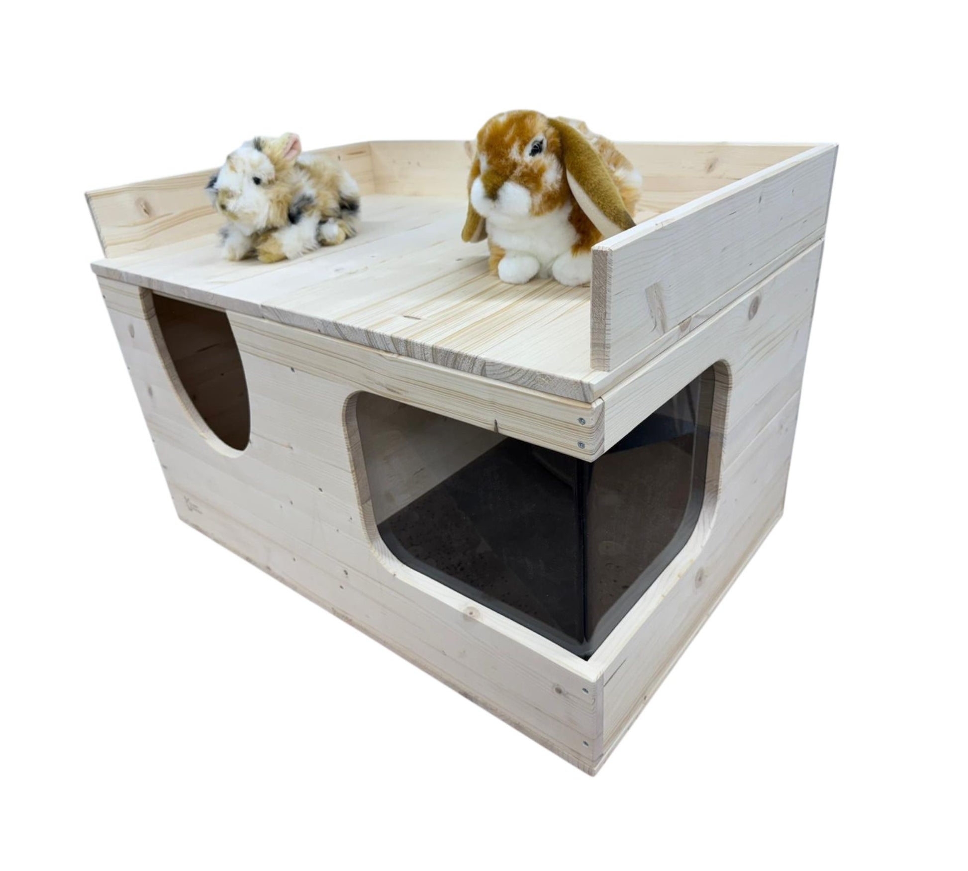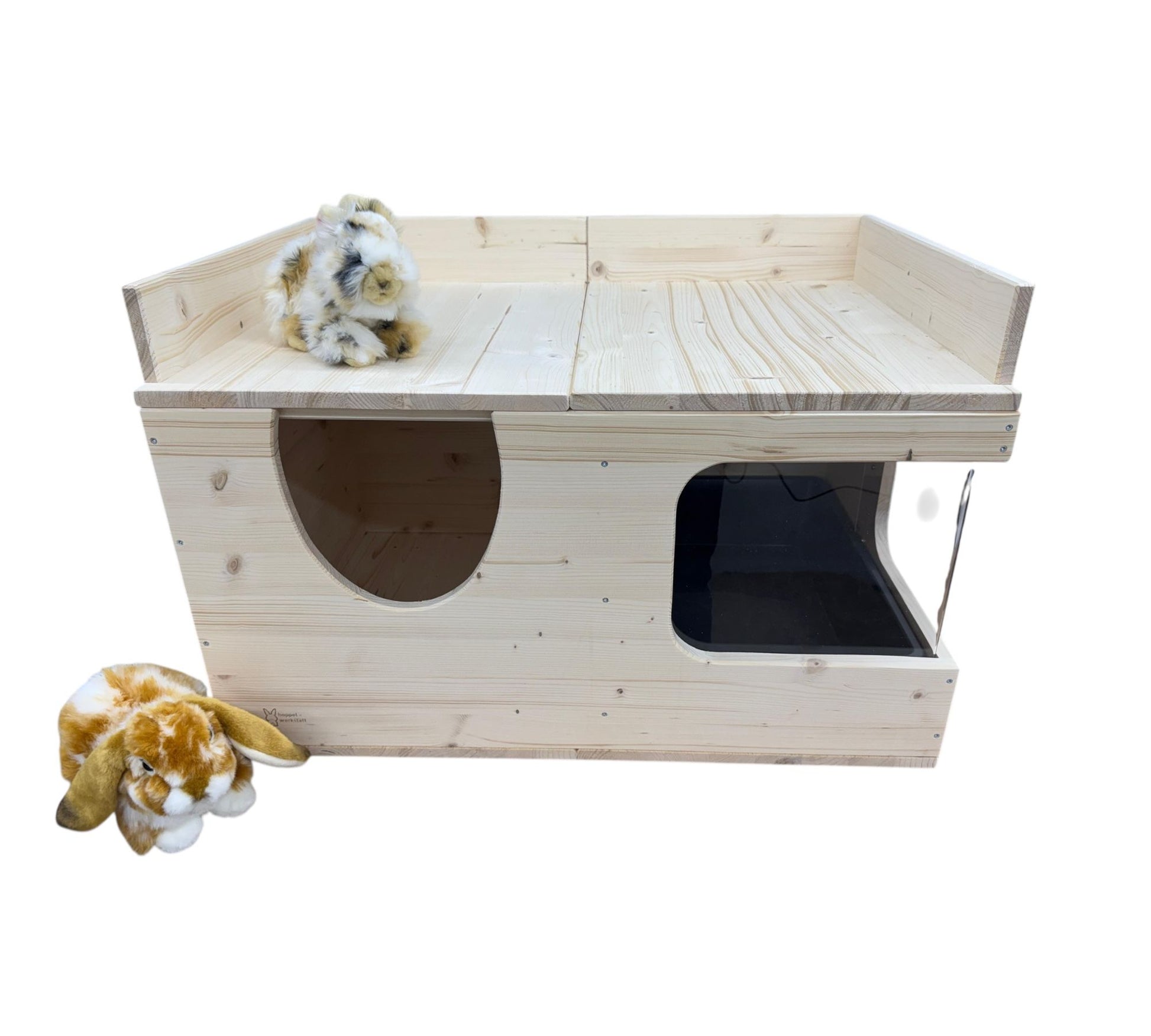 Die geräumige Box (80 × 54 × 54 cm) lädt zum Scharren, Wühlen und Verstecken ein – ganz so, wie es Kaninchen in freier Wildbahn tun.