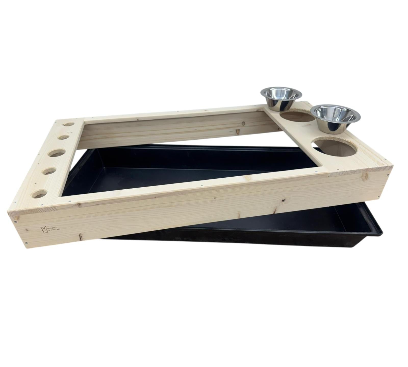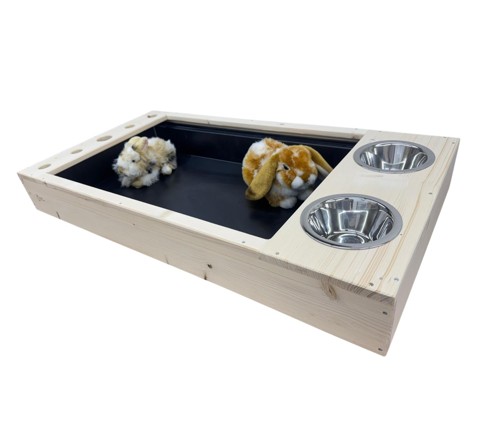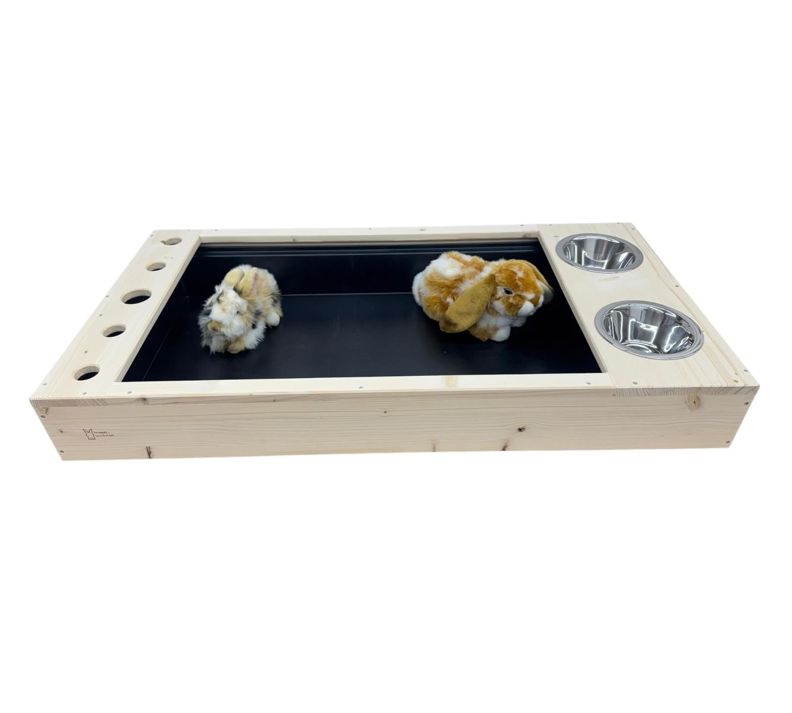 Das Fressklo Hoppel XXL bietet deinem Liebling viel Platz zum Fressen und Wohlfühlen. Mit einer Größe von 104x55x14cm und einer großen Kunststoffwanne von 100x50cm ist es geräumig genug für Kaninchen oder Meerschweinchen. Zudem sind Futternäpfe inklusive. Die Toilette kann je nach Verfügbarkeit in den Farben Grau, Grün oder Dunkelblau geliefert werden.
