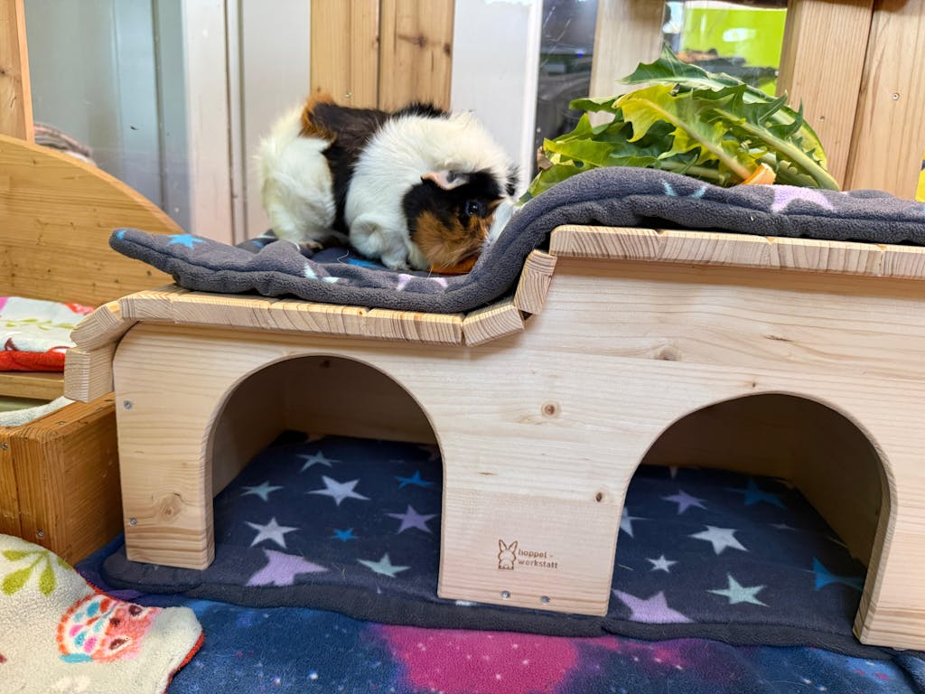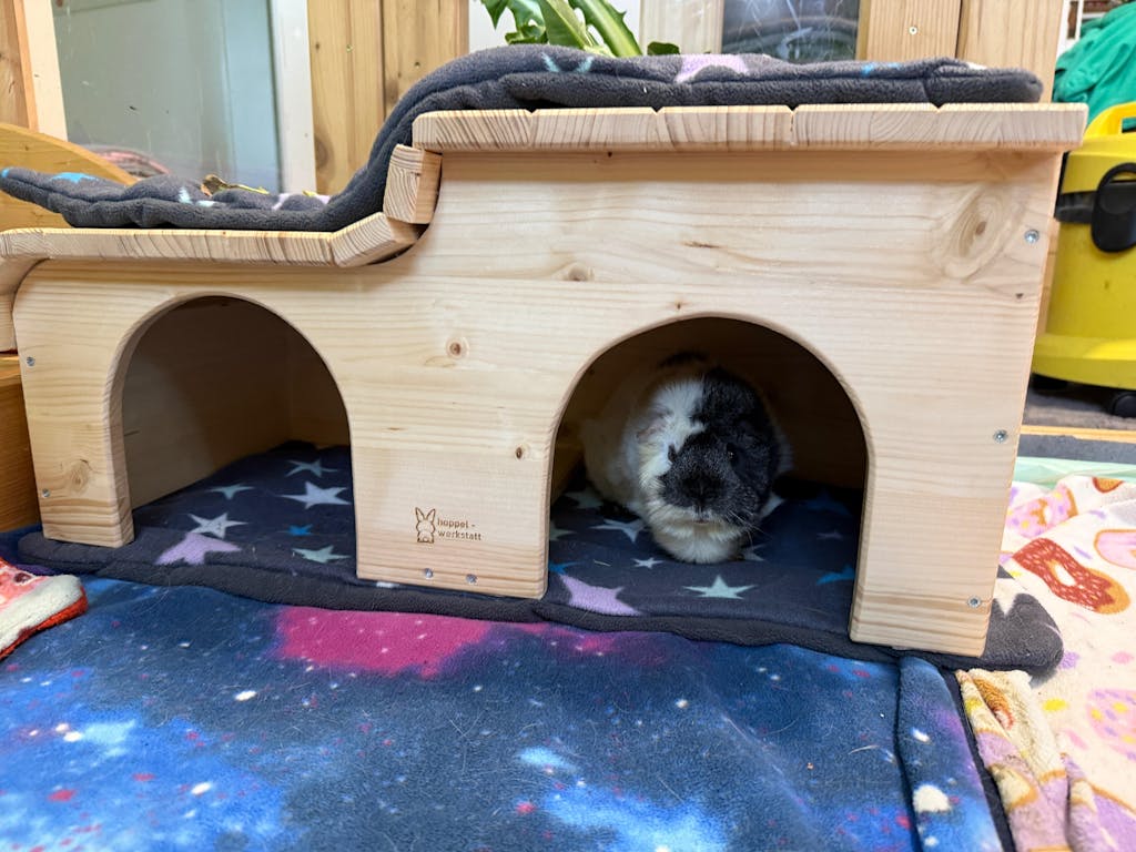 Unser Meerschweinchenhaus wird dein Liebling begeistern! Mit seinem abgerundetem Dach und zwei Eingängen bietet es eine gemütliche und geschützte Atmosphäre für kleine Nickerchen und als Rückzugsort.